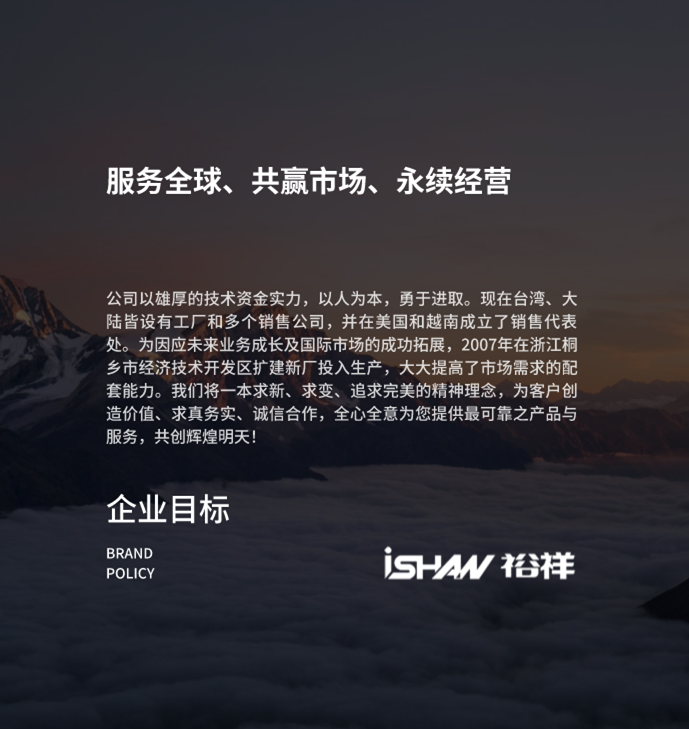公司以雄厚的技術(shù)資金實(shí)力,以人為本,勇于進(jìn)取。現(xiàn)在臺(tái)灣、大陸皆設(shè)有工廠和多個(gè)銷售公司,并在美國(guó)和越南成立了銷售代表處。為因應(yīng)未來業(yè)務(wù)成長(zhǎng)及國(guó)際市場(chǎng)的成功拓展,2007年在浙江桐鄉(xiāng)市經(jīng)濟(jì)技術(shù)開發(fā)區(qū)擴(kuò)建新廠投入生產(chǎn),大大提高了市場(chǎng)需求的配套能力。我們將一本求新、求變、追求完美的精神理念,為客戶創(chuàng)造價(jià)值、求真務(wù)實(shí)、誠(chéng)信合作,全心全意為您提供最可靠之產(chǎn)品與服務(wù),共創(chuàng)輝煌明天!